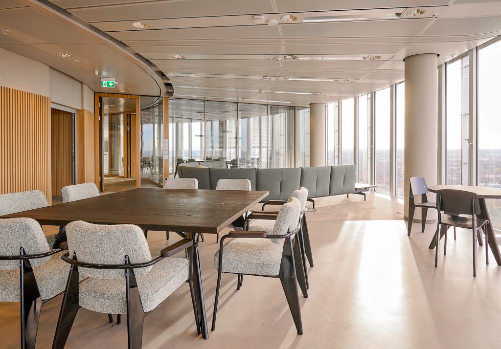 Eine besondere Herausforderung stellte die gerundete Gebäudeform des Towers dar, die sich durch alle Ebenen zieht und maßgeblichen Einfluss auf Planung und Ausführung hatte. Der Ausbau erforderte daher präzise Detailabstimmungen und eine konsequente Anpassung aller Bauteile an die bestehende Geometrie.